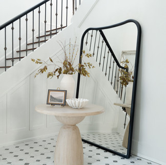 We knew we wanted that wow moment as soon as you walked in. So we replaced the flooring with bold checkered tiles and brought in a round pedestal table with warm wood tones, topped by a large wavy mirror that bounced light and added depth. The final layer? A sculptural chandelier that instantly elevated the entry.